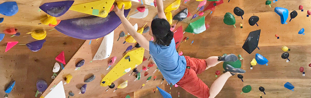 ボルダリングはクライミング専用のシューズと滑り止めのチョークがあればトライすることができます。クライミングは腕力だけではなく身体全体を使った全身運動で、登るコースの難易度にもよりますがマッチョな方でなくても登れ、子供から高齢の方まで男女問わず楽しんでいるスポーツです。